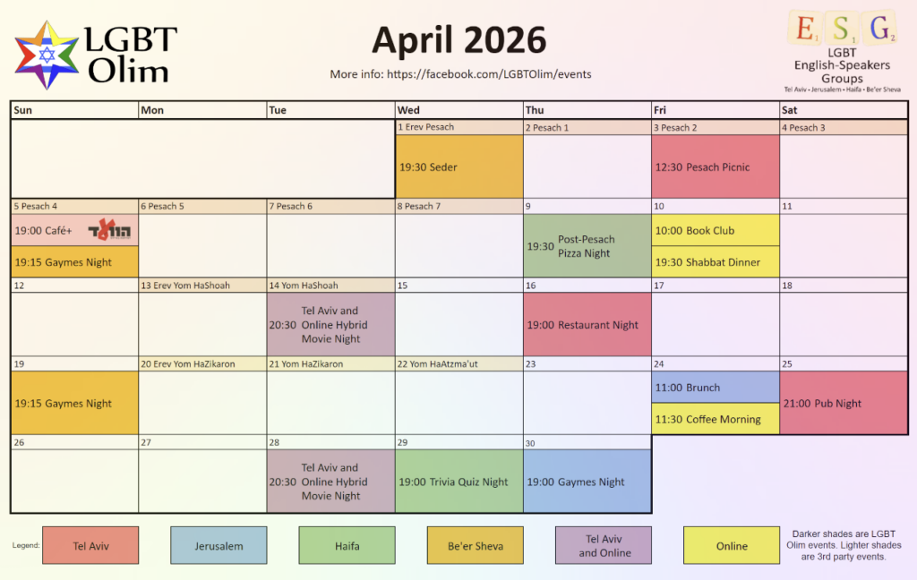 The LGBT English-Speakers Groups organize social events in Tel Aviv, Jerusalem, Haifa, Be’er Sheva and online. Anyone in Israel who is LGBTQ+ and speaks English (either natively or as a learnt language) is welcome to join us.
