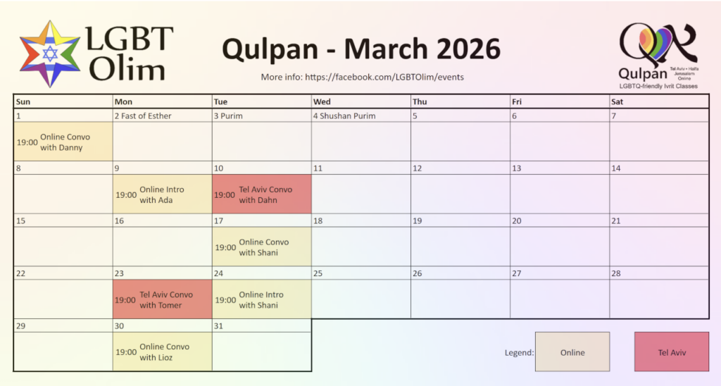As well as covering practical conversation, we also discuss LGBT-related topics and issues that would not be covered in a regular ulpan (or Hebrew class).